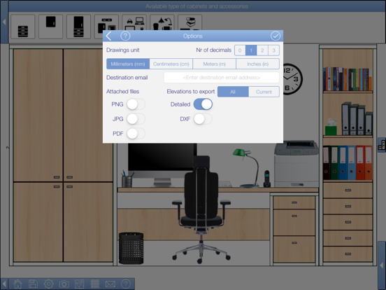 Design a office with your iPad, iPhone or iPod, inserting items in the front view of each one of the room walls. Insert cabinets, furniture and accessories. Select materials and finishes among woods, colors and accessories. Save your designs in your device or email them in ".pdf", ".png", ".jpg" or ".dxf" format.