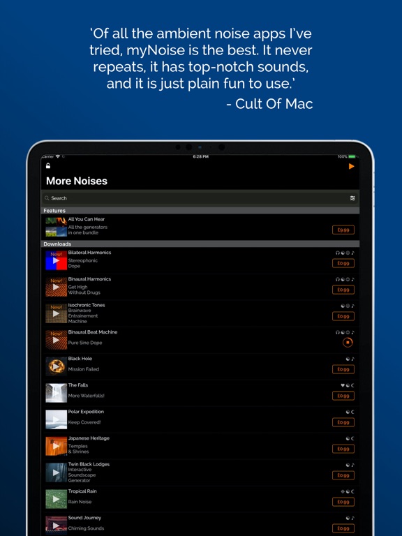 ‣ "Of all the ambient noise apps I’ve tried, myNoise® is the best. It never repeats, it has top-notch sounds, and it is just plain fun to use." - Cult Of Mac.