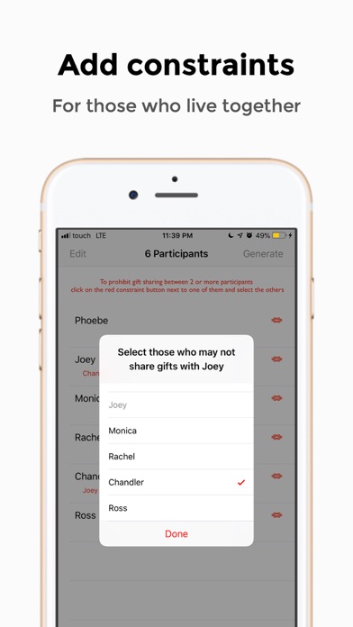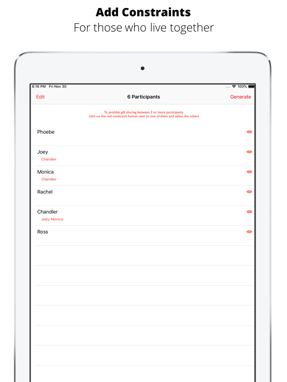 The app will let you add constraints to prohibit sharing between 2 or more participants before it generates the results, so if you live in the same house with someone and it’s hard for you to keep it a secret, to forget to use Constraints.