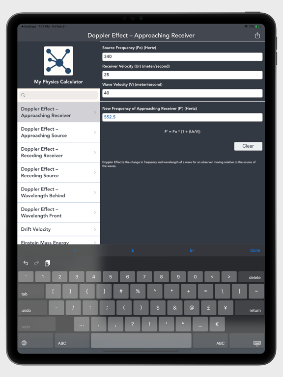 My Physics Calculator contains 134 Calculators, for different Physics and Engineering Parameters. Simple User Interface with immediate results. Formulas and Definitions are provided for each calculator..