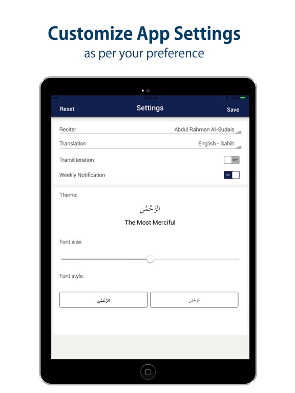 • Select from different Reciters (Al-Sudais, Al-Afsay) for soulful recitation