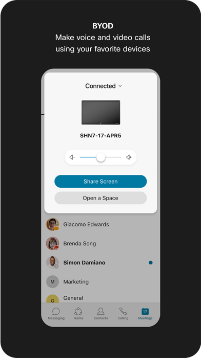 • Bring The Experience Into Meeting Rooms: Pair your app to a Webex device, such as the Webex Board, to do things like wirelessly control meetings and save whiteboard drawings
