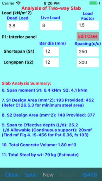 The analysis screen will also have certain default data pertaining to the load and reinforcement bars. Users can edit these data based on the actual application and measurement. This is to make sure all the data entered are correct. Once entered report is presented in a scroll-able text view as shown in the screen shots.