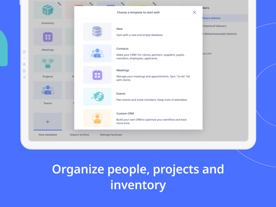 Unlimited use cases: CRM, events, invoicing, inventory, real estates and many more.