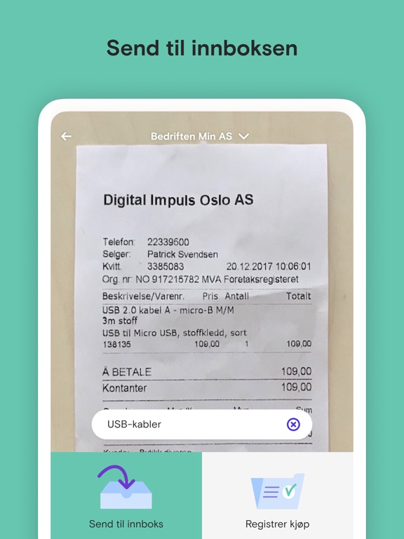 Utgifter er sjelden gøy, men hos oss er de i hvert fall enkle å bli ferdige med: Bruk appen vår til å kvitte deg med kvitteringene dine i en fei! Ta bilde, registrer kjøpet med det samme, eller send det til innboksen din, og gjør det når det passer deg. Inntekter er både gøy og enkelt. Faktura/tilbud/ordrebekreftelse kan sendes rett fra appen.