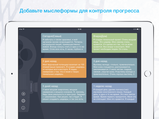 Для удобства пользователей в приложении предоставляется множество примеров формулировок целей (слайдов), а также ежедневных подтверждений (мыслеформ). Можно создать слайд какой угодно темы либо выбрать из имеющихся: