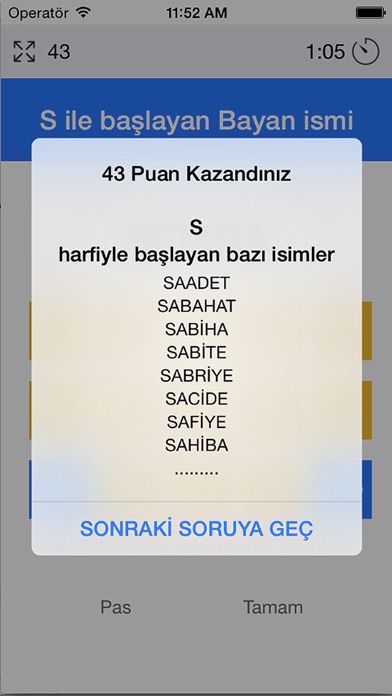 İsimler, erkek ve kadın ismi olarak iki ayrı grup şeklindedir. Uygulama güncel ve eski olmak üzere aklınıza gelebilecek bütün isimleri içeren zengin bir arşive sahiptir. Bu bölümde artık unutulmaya yüz tutmuş eski isimlerimizi de bulabilirsiniz. Hayvan, bitki ve ülke isimleri de benzer şekilde özenle seçilmiştir. Oyunun orjinal konseptinde olmaması nedeniyle Başkentler bölümünü oyuna dahil edip etmemek isteğinize bırakılmıştır. İsterseniz bu seçeneği ayarlar bölümünden oyundan çıkartabilirsiniz.