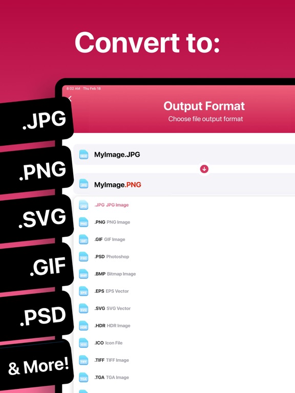 JPG, PNG, GIF, PSD, BMP, EPS, SVG, EXR, ICO, TIFF, TGA, WBMP, WEBP, ODD, PSD, PS, PDF