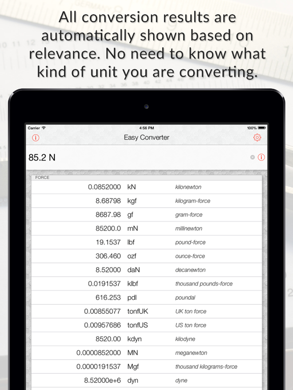 A definitive, easy-to-use unit and currency converter, for iPhone, iPod and iPad. It’s just like a web search: You can perform conversions by simply typing what you want to convert, in a single input, just like you do to search the web for years. It's also a complete and ultimate tool, providing more than 900 units and 170 currencies available for you.