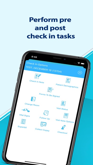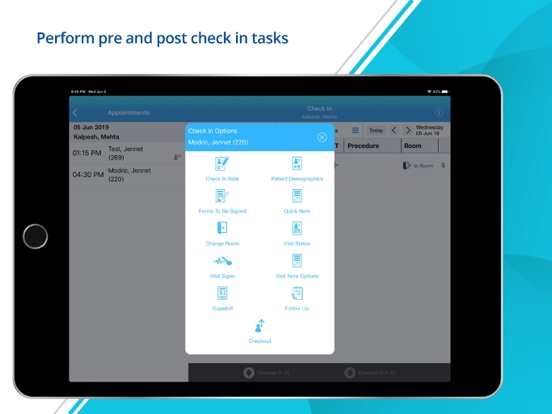 • Check-in/out: Check-in/out any scheduled patients, dictate visit notes, record patient vitals, change visit status, assign rooms, view patient details, record, upload transcriptions, enter check-in notes, create superbill