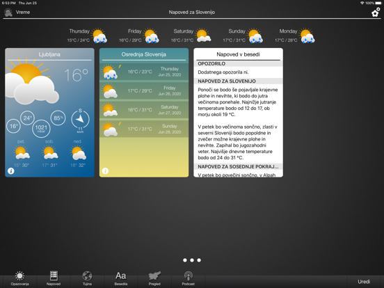 Aplikacija Vreme omogoča pregled trenutnega vremenskega stanja na številnih lokacijah v Sloveniji, na uporabnikovo željo pa lahko z uporabo tehnologije GPS (iPhone različica) tudi poišče njemu najbližjo lokacijo.
