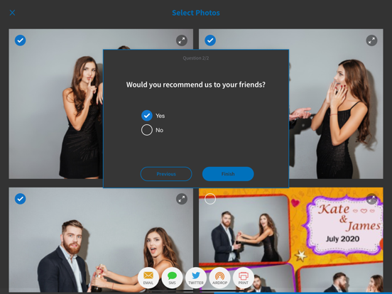 You can print your photos directly if you have a printer that supports AirPrint or to the printer connected to dslrBooth or LumaBooth. You can also add a disclaimer to be displayed to guests before they're allowed to share or print.