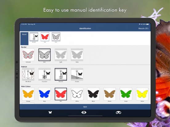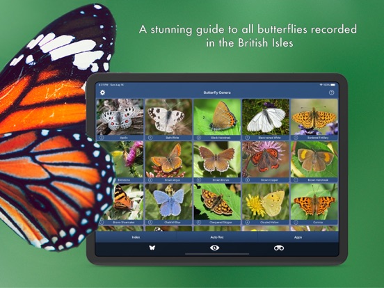 Butterfly Id will help you quickly and easily identify species through the Id key and through photo recognition. Butterfly Id is great fun to use. Identification can be enjoyed by the whole family. For the enthusiast there is anatomical, ecological and taxonomic information too.