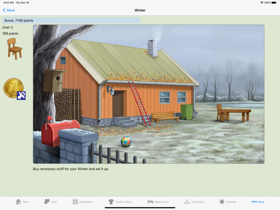 When the player clicks on the yellow coin in any of the rooms: Baby Room, Bathroom, Winter House, etc the new screen is opened with the options to purchase points. The current game score will be updated with purchased points amount. In addition ads will not be displayed in the game.
