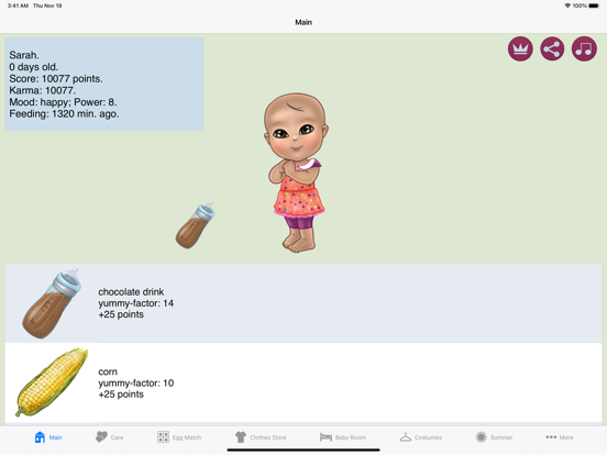 Having acquired clothes the player is able to dress her child in a special costume for fun and change looks! She can then share her baby dressed in different costumes via social networks.