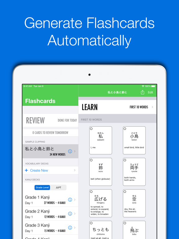* Built-in kanji flashcard decks up through Middle School.