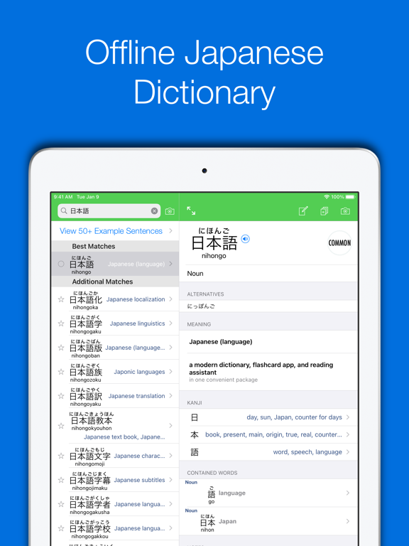 Nihongo is an offline Japanese dictionary, flashcard app, and reading assistant, designed to make the best use of the time you dedicate to studying Japanese.