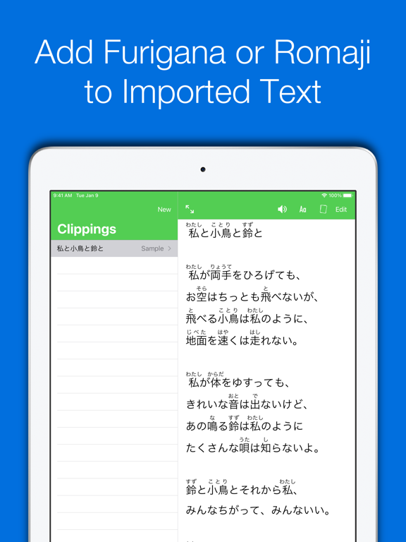 "Clippings", our reading assistant, is what makes Nihongo stand apart from other dictionaries. Paste in Japanese text from a website, email, an eBook, or anywhere else, and we'll add furigana or romaji to every word. We also enable you to tap on any word to see its definition. This will truly change the way you read Japanese. And now, you can get the same experience right in Safari using our Safari extension.