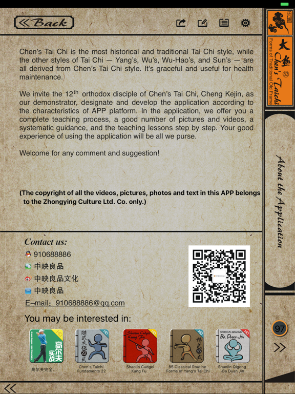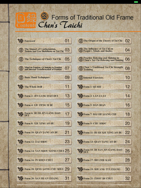 We invite the 12th orthodox disciple of Chen’s Tai Chi, Cheng Kejin, as our demonstrator, designate and develop the application according to the characteristics of APP platform. In the application, we offer you a complete teaching process, a good number of pictures and videos, a systematic guidance, and the teaching lessons step by step. Your good experience of using the application will be all we purse.