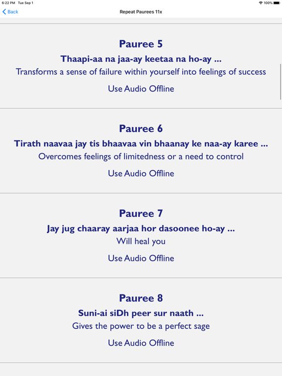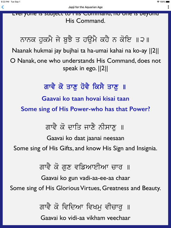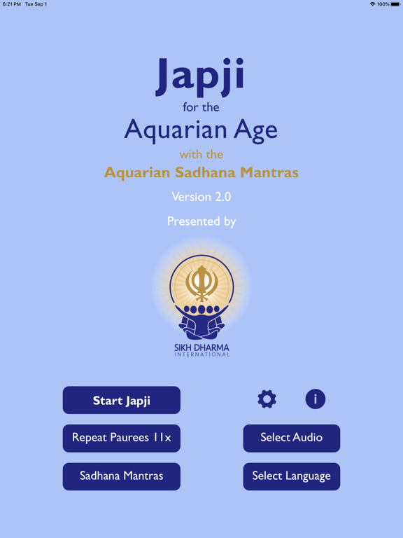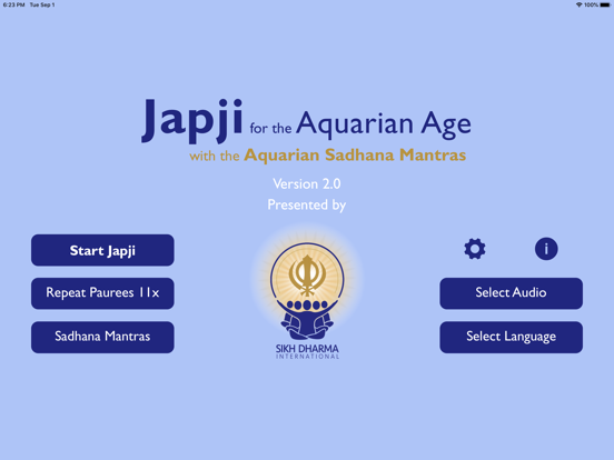For the first time, with this Version 2.0 of the app, users can “Select Language” to select either English or Spanish. And the app will display in either Vertical or Horizontal device orientation. You can also “Select Audio” with three possible audio recordings of kirtan artists, Snatam Kaur, Nirinjan Kaur or Sada Sat Simran Singh. These recordings have very authentic and accurate pronunciation. Each audio is at a different slow, medium or fast pace. The slow audio will be perfect to learn Japji. The medium is for the intermediate reader and the fast audio is perfect if you are very familiar with Japji. You can also choose to “Disable Audio” so as to read Japji at your own pace. With “Select Language” you can also choose to display the words in Gurmukhi, or transliteration, or the translation – both available for English and Spanish. You can choose to display one or all three of these options and in the “Settings” you can select four different sizes of the text. There is a “Daily Reminder” function to set a timer to remind you when you want to read Japji each day. Another feature is that you can choose to read along with the “Repeat Paurees 11x”, choosing any of the 40s sections of Japji to repeat 11 times. This app also has all the words for the Aquarian Sadhana mantras that you can read along with in any darkened room as your device screen is illuminated. In Japji Sahib Guru Nanak touches the deepest essence of individual consciousness, elevating one to the universal consciousness. The reciting of Japji aloud transforms through the powerful Naad vibration of these sounds. Recite it, connect to it and feel the power of it like never before!