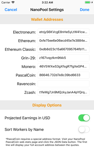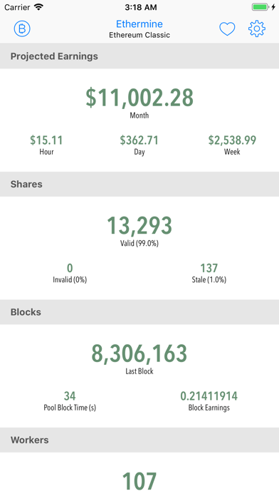 • Option to show projected earnings in coins or USD for month, week, day, and hour (Ethermine, Flypool, NanoPool, EthPool)