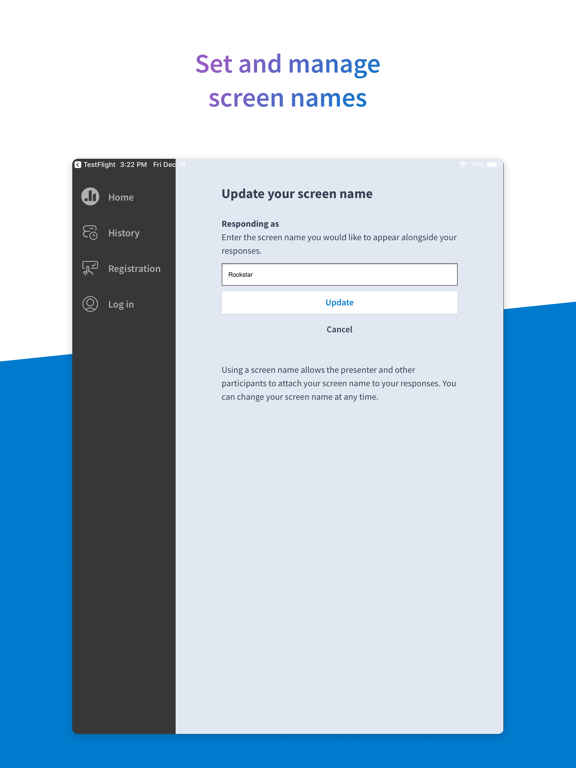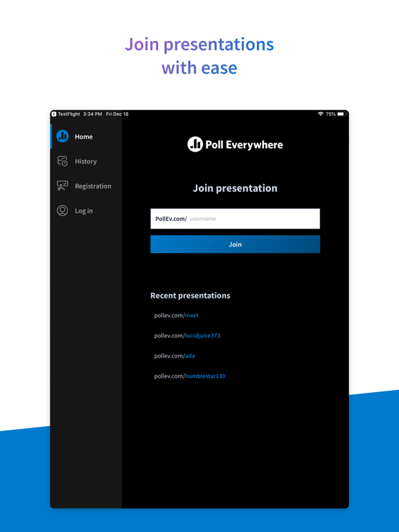 Respond to live Poll Everywhere questions from anywhere with the Poll Everywhere app for iOS. Sign in and register with speakers for attendance or graded questions. Then, review your response history and check correctness over time. Download Poll Everywhere for iOS today and be ready for your next interactive class or event.