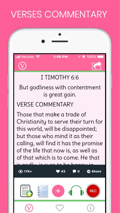 The app displays a daily verse, that includes the verses commentary for deeper study. There is also a devotional for application and study of that same verses! You can also mediate on what you read, writing in your own personal diary right inside the app.