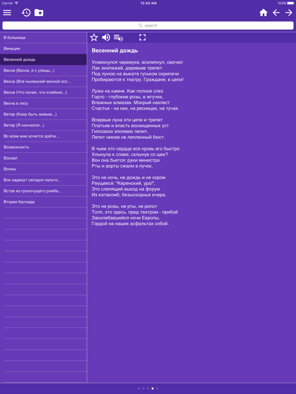 Стихи русских поэтов - приложение, содержащее стихи более 160 русских поэтов. В приложении вы всегда быстро сможете найти нужное стихотворение через поиск. А если вы не знаете, что почитать - наугад нажмите несколько раз по экрану и перед вами откроется случайное стихотворение! Также в приложении доступен удобный выбор по автору.