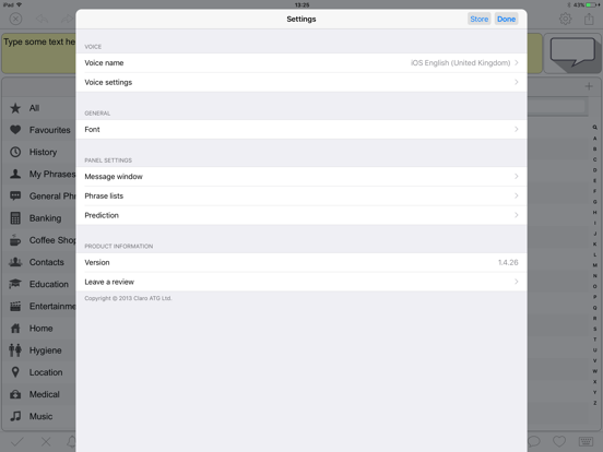 Text in the Message Window is spoken using the standard iOS text-to-speech voices. Text in the Message Window can be sent by Message and Mail, as well as copied into other apps.