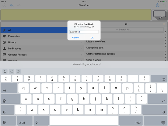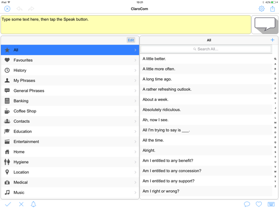 Create text using the phrase banks to find a phrase. ClaroCom is loaded with some standard phrases. More phrases can be added and history is stored of what is typed.