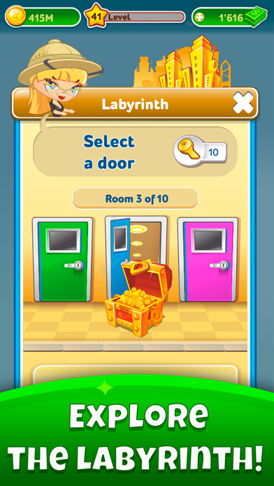Like keys to the labyrinth. If you open all 10 doors of the labyrinth and never hit a dead end, you'll get a spectacular reward: a chest full of gamer's treasure—gold coins, bucks, and other cool stuff you can use to expand your business.