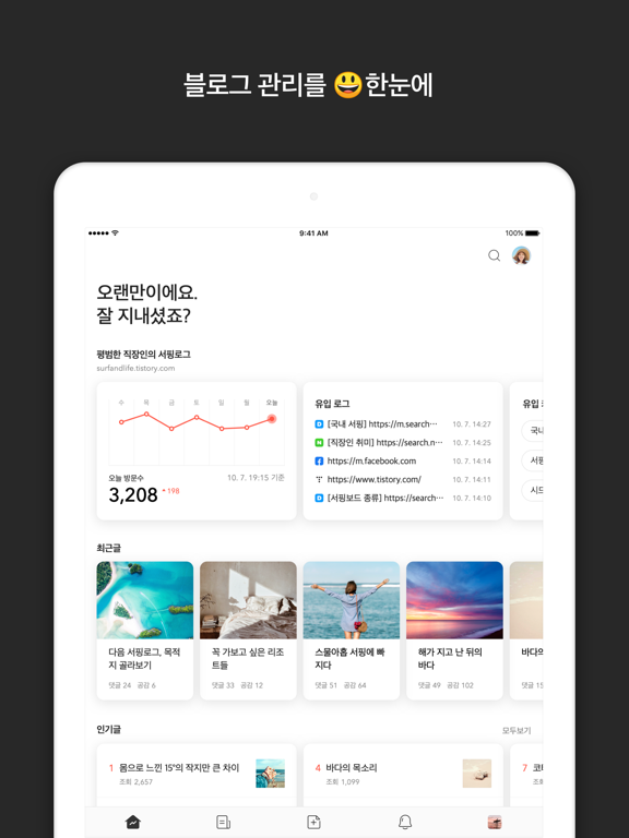 블로그의 지금 이 순간 정보를 한 눈에 바라볼 수 있습니다.