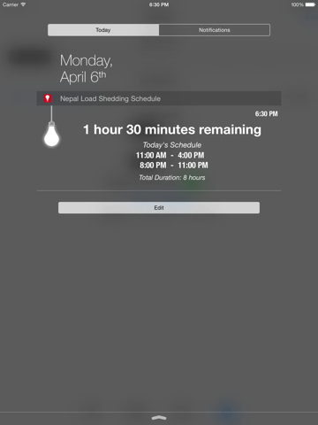 Get up to the minute updates on load shedding. See the load shedding schedule right on your lock screen with today widget in iOS 8. Plan your time around the load shedding schedule. Nepal Load Shedding Schedule is designed in such a way that it always shows you the schedule in Nepali Time. No matter if you have set your time zone to San Francisco, U.S.A. time, Tokyo, Japan time, Sydney, Australia time, or any other time, this app will show you the current time in Nepal and notify you at correct times before load shedding begins or ends in Nepal.