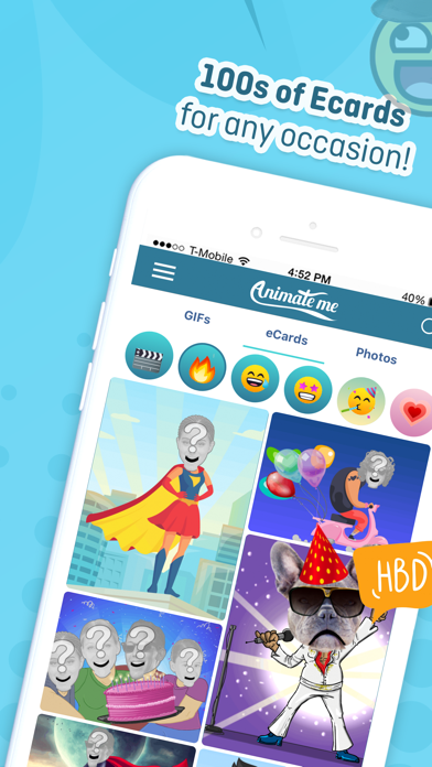 * Add the faces of friends, family, pets, cartoons and more to funny GIFs, videos and eCards.