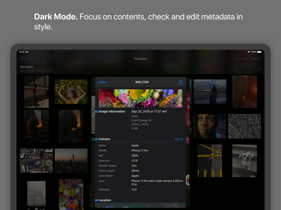 Metapho is a simple and clean viewer for photo metadata such as date, file name, size, camera model, shutter speed, location.