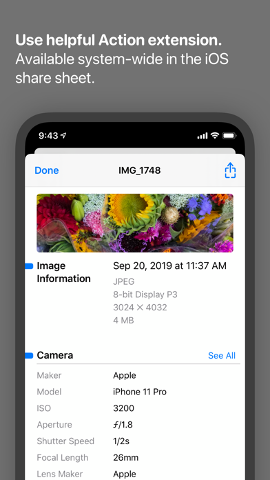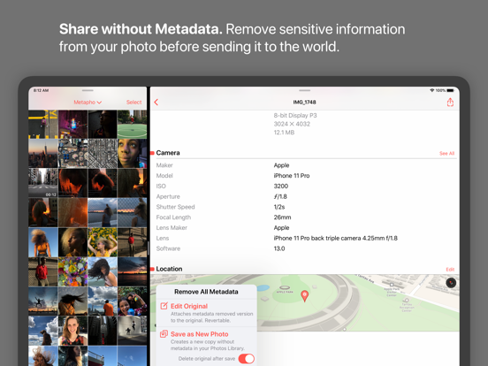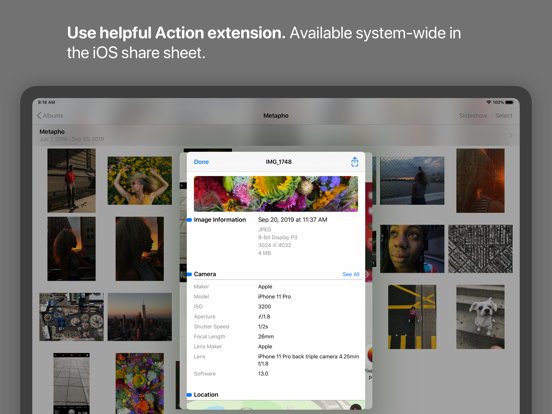 Metapho Action lets you check metadata of a photo, and export it without metadata, from anywhere with iOS share sheet.