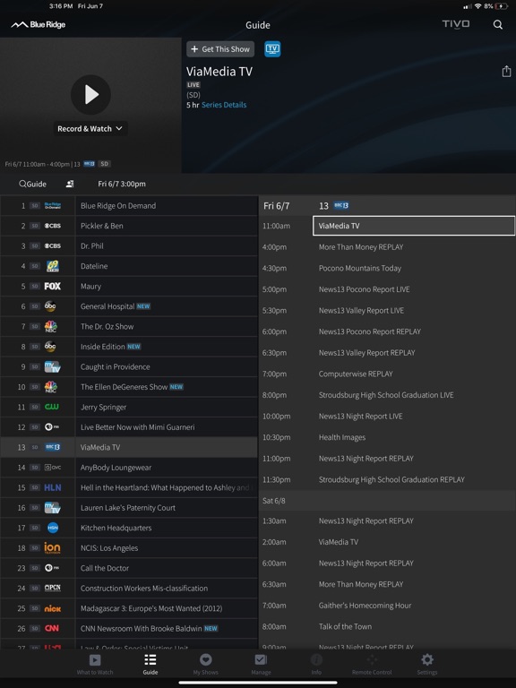 Blue Ridge Go TiVo app! Schedule recordings on the go. Watch recordings*