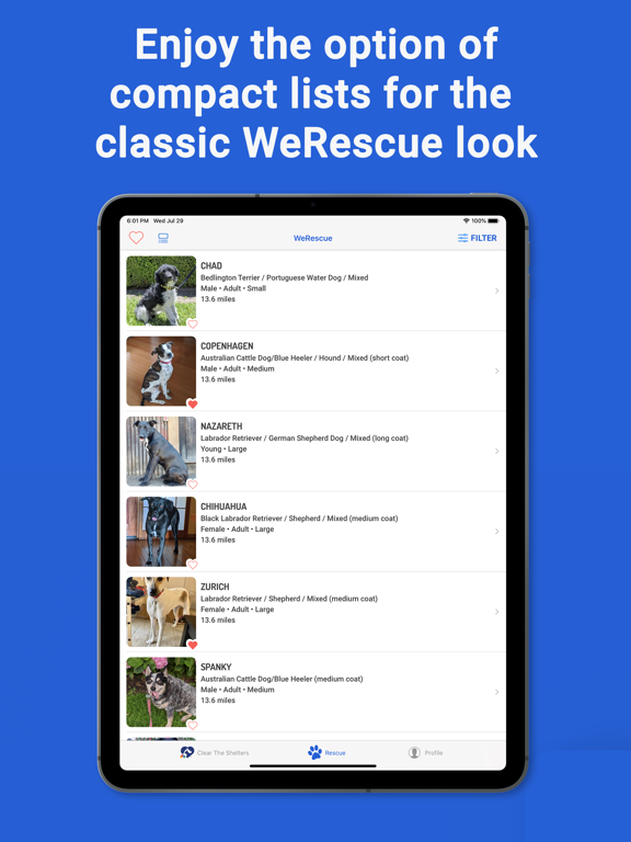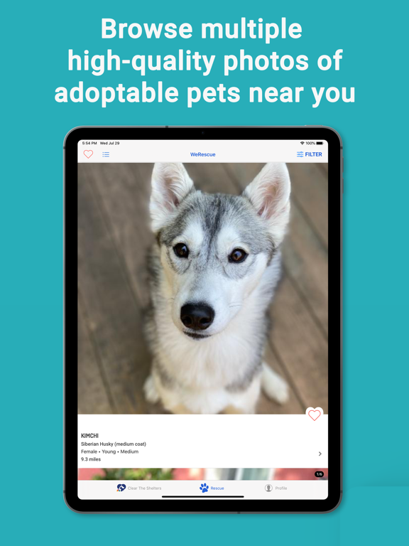 WeRescue app connects you with hundreds of thousands of pets across the United States – easily and quickly! Pets from shelters and foster-based rescues are shown in order of distance from your location. Enter zip codes for different areas. WeRescue can cap your search to a certain distance and let you specify gender, age, size, breed, and so many more. WeRescue offers more filters than any other adoption app!