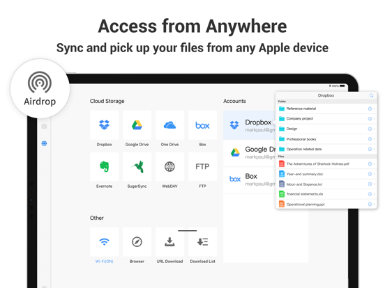 ・ Store and secure files on iCloud Drive, Dropbox, OneDrive, Google Drive, Evernote, Box, FTP, WebDav, etc.