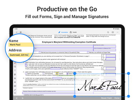 ・ Fill out any PDF forms with interactive fields such as text fields, checkboxes, radio buttons, combo boxes, list boxes and etc.