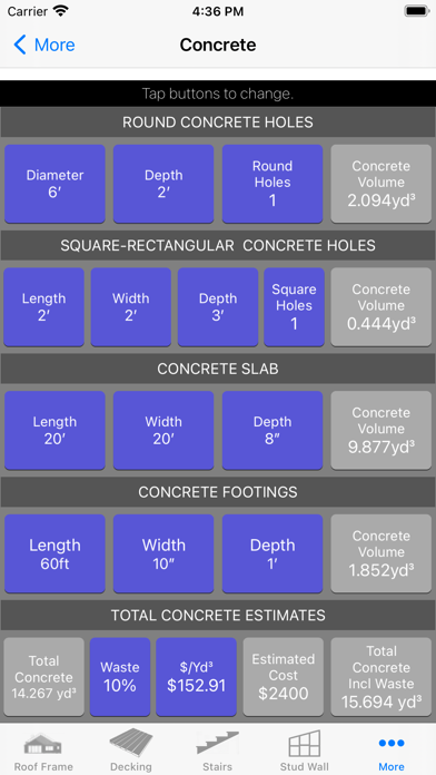 Framing and roofing, decking, stairs, concrete, stud wall carpentry calculator.