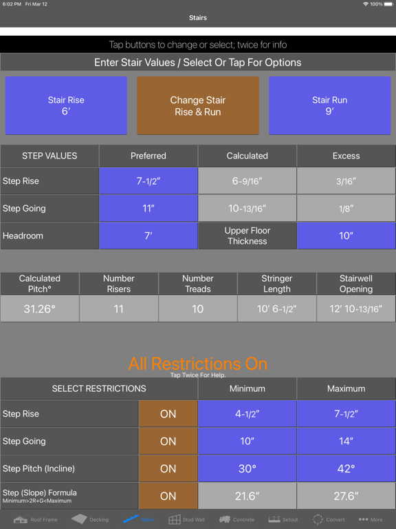 Also calculations allow for situations where the overall stair rise and run are fixed or variable allowing maximum flexibility.