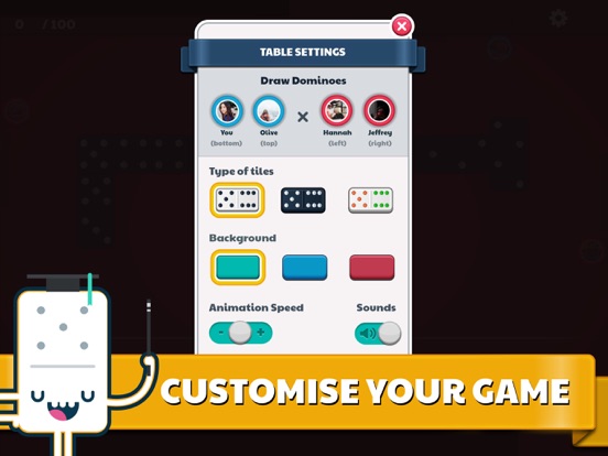 • Customization options! (Choose your favorite tile style, table type, and the dominoes animation speed)