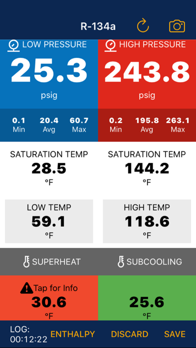The pressure, temperature, and vacuum readings are displayed, along with key system analysis data, in an easy-to-read format with screenshot and data log sharing capability.