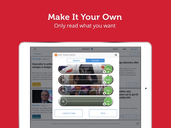 - Your very own news feed - a smart topics management system allows you to choose your favorite topics/categories, block completely topics that don't interest you, and choose topics you want to get notifications about! A news feed created by you, especially for you.
