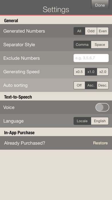 The Random Number Generator+ is the quickest way to generate a random number or batch of numbers in range you specify. Simply set the min, max, quantity and tap the “Generate” button. There are also many other settings you can choose, among others odd/even numbers, separator style, numbers exclusion and generating speed. You may also want to try the voice mode for the fun of it!