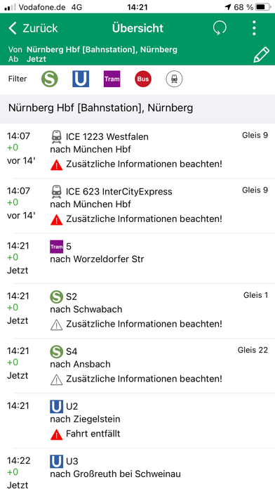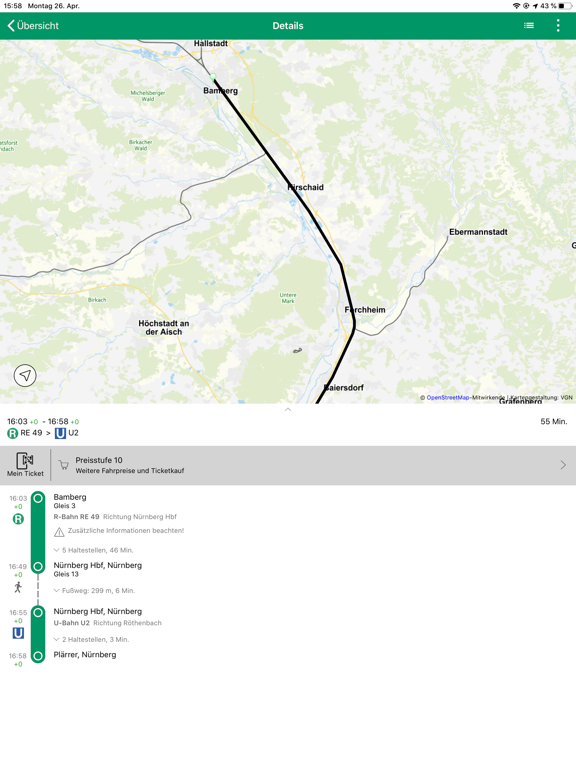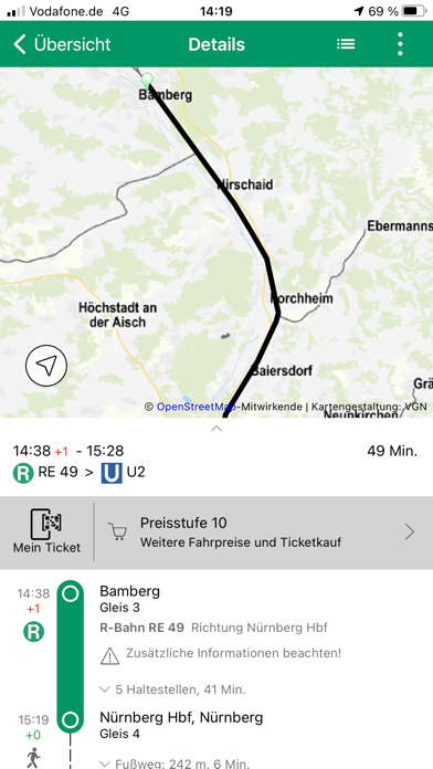 VGN Fahrplan & Tickets ist die mobile Fahrplanauskunft des Verkehrsverbundes Großraum Nürnberg (VGN). Ob Sie mit S-Bahn, R-Bahn, U-Bahn, Tram oder Bus im Verbundgebiet unterwegs sind – VGN Fahrplan & Tickets ist Ihr stets verfügbarer Begleiter. Schnell und unkompliziert erhalten Sie Verbindungsauskünfte, aktuelle Abfahrtszeiten und sehen, auf welchem Gleis Ihr Zug abfährt. Dank Echtzeitinformationen bleiben Sie auch bei kurzfristigen Änderungen oder Störungen stets auf dem Laufenden. Detaillierte Karten und Netzpläne sind ebenso wie Hinweise und Benachrichtigungen zu Fahrplanänderungen verfügbar. Kaufen Sie schnell und bequem ausgewählte VGN-Tickets - und wenn Sie möchten - gleich direkt aus der Verbindungsauskunft. Übrigens, in Nürnberg wird inzwischen jeder vierte Einzelfahrschein über diese App erworben.