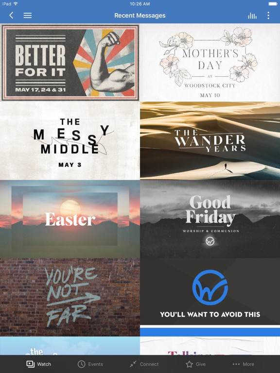 The Woodstock City Church App was created with the Subsplash App Platform.