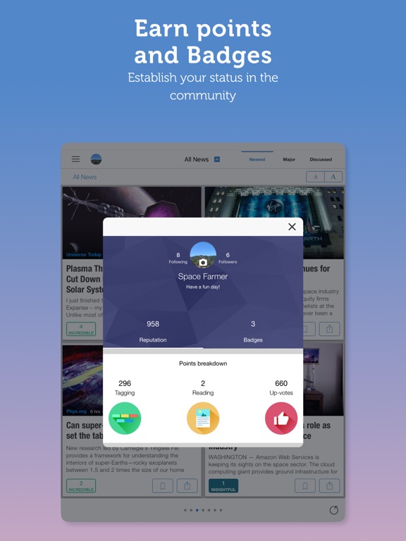 * A community of Space buffs! Post stories, videos or polls, comment on stories, tag articles, earn points and badges!