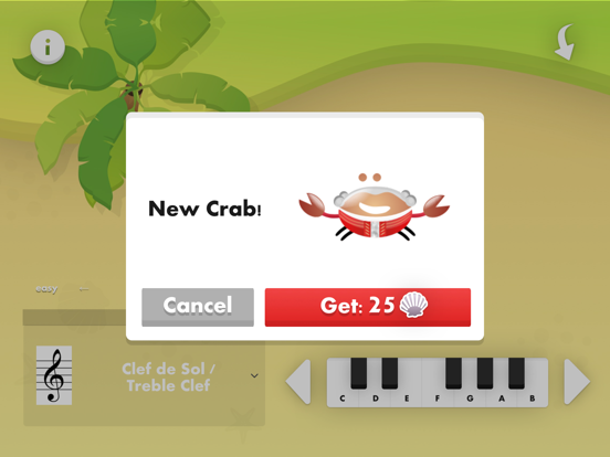 Just select your crab, your keyboard and begin the game. Beginner’s Tip: On level 1 pick treble clef or bass clef and let the keyboard notes guide you. Listen carefully to the intervals between the notes to work out the name of the next note. The better you get at reading the notes, the larger the intervals become and the harder the sight-reading becomes!
